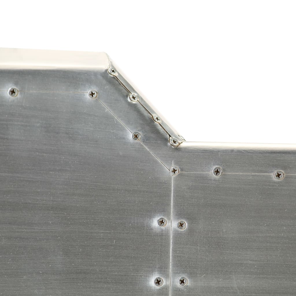 Dieser Schreibtisch im Vintage-Stil bringt mit seinem zeitlosen Design einen Hauch von Industrie-Stil in Ihr Arbeitszimmer oder Büro. Der Schreibtisch im Flugzeug-Stil ist aus massivem Mangoholz gefertigt, wobei die Oberfläche mit polierten Aluminiumblechen verkleidet und mit sichtbaren Stahlschrauben versehen ist, was ihn sehr strapazierfähig macht. Die Stahlbeine in Messing-Farbe und die gemusterten Nieten verleihen dem Fliegertisch einen industriellen Look. Zudem verfügt er über eine große Tischplatte, die Platz für Akten, Unterlagen, Bücher und andere Gegenstände bietet. Der Schreibtisch ist einfach zu montieren. Bitte beachten: Das Muster der Nieten kann von Stück zu Stück variieren, was jeden unserer Tische einzigartig macht; die Lieferung erfolgt in zufälliger Reihenfolge.