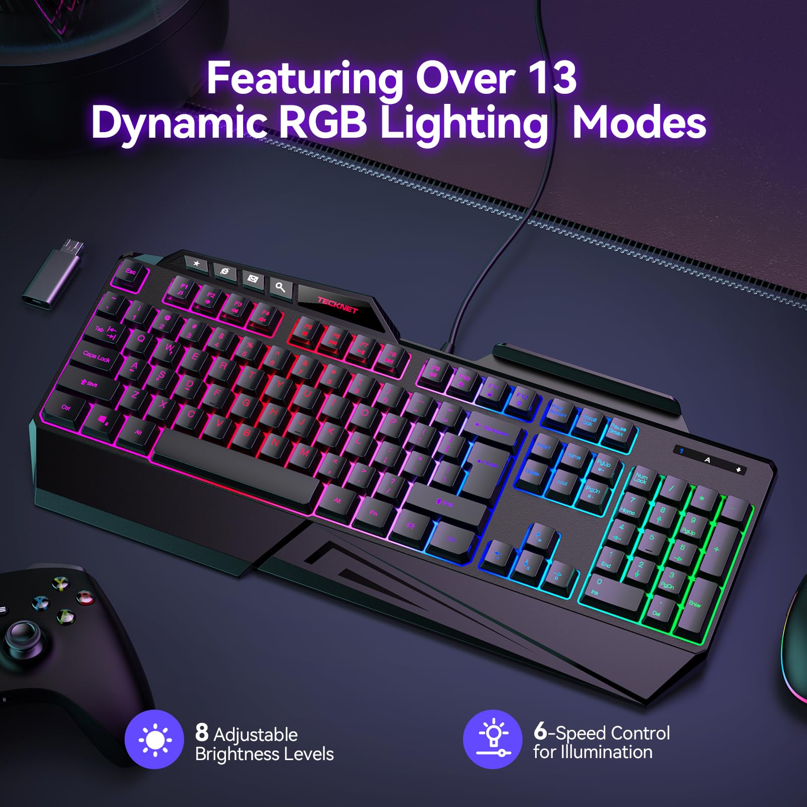 TECKNET Kabelgebundene RGB-Gaming-Tastatur – 26-Tasten-Anti-Ghosting, 13 Beleuchtungsmodi, spritzwassergeschützt, 108 Membrantasten, Plug & Play – mit ergonomischer Handballenauflage und Telefonhalterung für Windows/Mac (Schwarz)