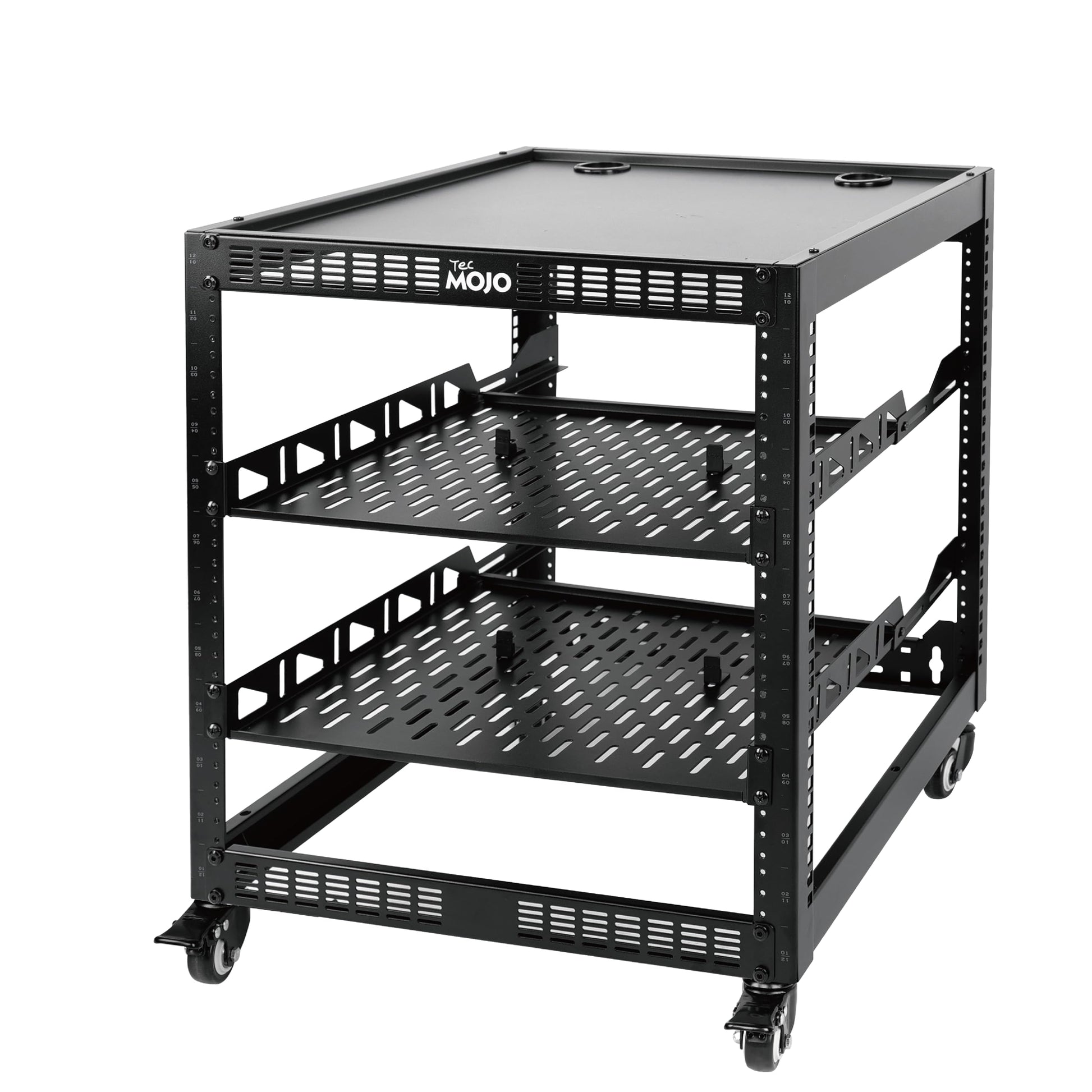 TECMOJO 12U Open-Frame-Netzwerkschrank für IT- und AV-Geräte, 4-Pfosten mit Rollen, mobil, inklusive 2 x 1U-Serverablagen und Montagematerial, für 19"-Netzwerk-, Audio- und Videogeräte