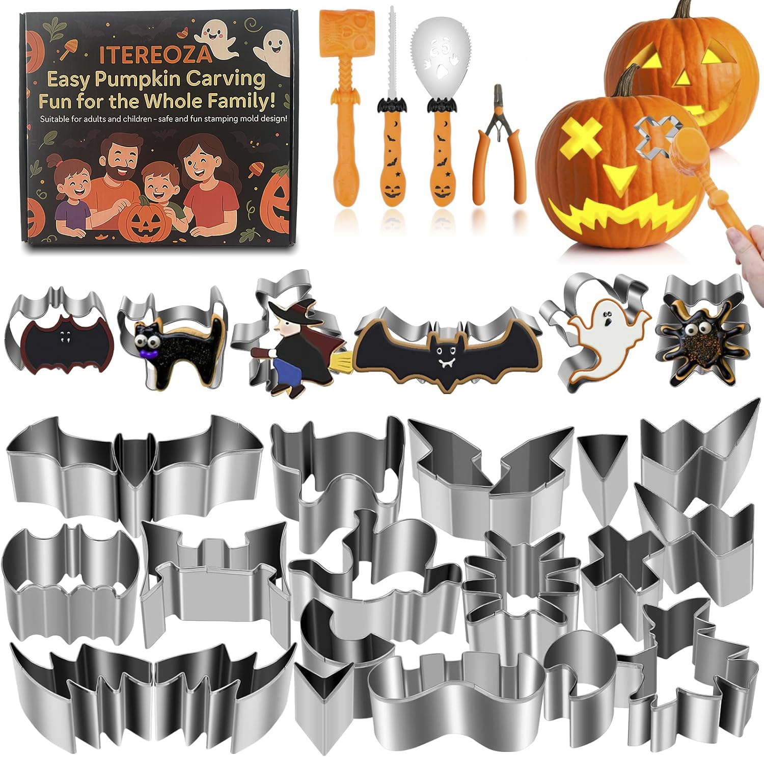 Pumpkin Carving Kit Tools Halloween, 25PCS Safe DIY Pumpkin Carving Kit Tools for Kids and Adults, Reusable Stainless Steel Carving Kit Tools for Halloween Decorations (With Hammer & Pliers)