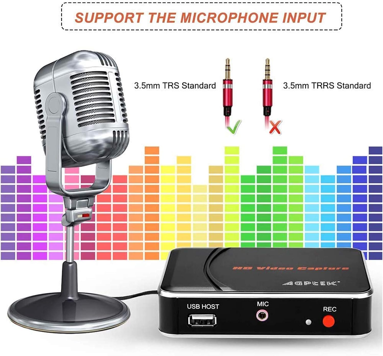 - 【Mic-in for Commentary】-- This capture card has microphone input and you can use it to add external commentary when playing a game, but it doesn't record party chat. Please note that it only accepts 3.5mm TRS standard microphone headset