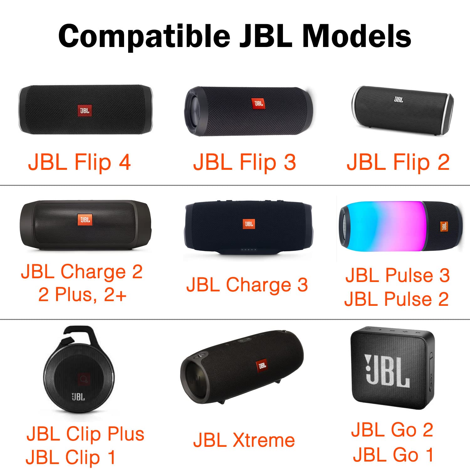 • Fit for JBL Flip 2, Flip 3, Flip 4, JBL Pulse 2, JBL Pulse 3, JBL Clip, JBL Clip Plus, JBL Charge 2+, JBL Charge 3, JBL Xtreme, JBL Go 2