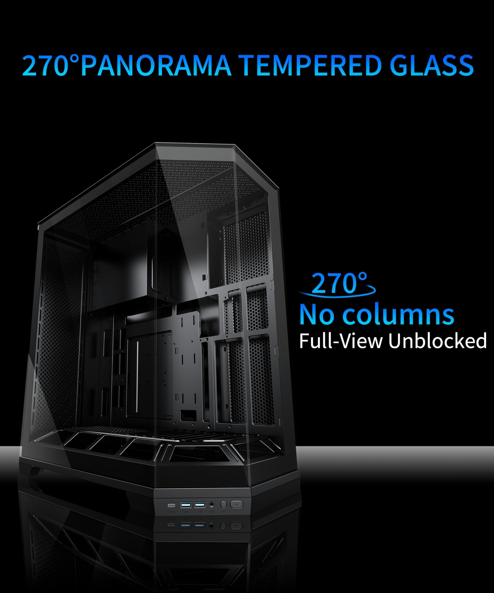 Advanced Cooling System Blending Performance and Aesthetics: Pre-installed with 5 ARGB PWM fans-including 2 top-mounted forward-flow fans (intake) and 3 side-mounted reverse-flow fans (exhaust)-the case establishes a vertically oriented airflow, setting a benchmark for PC case airflow. It supports up to 10 fan mounts in total. Additionally, the rear panel accommodates a 240mm or 360mm liquid cooling radiator, while the top is compatible with a 240mm radiator, providing dual cooling support for high-power processors and meeting the thermal demands of a high-end PC case.