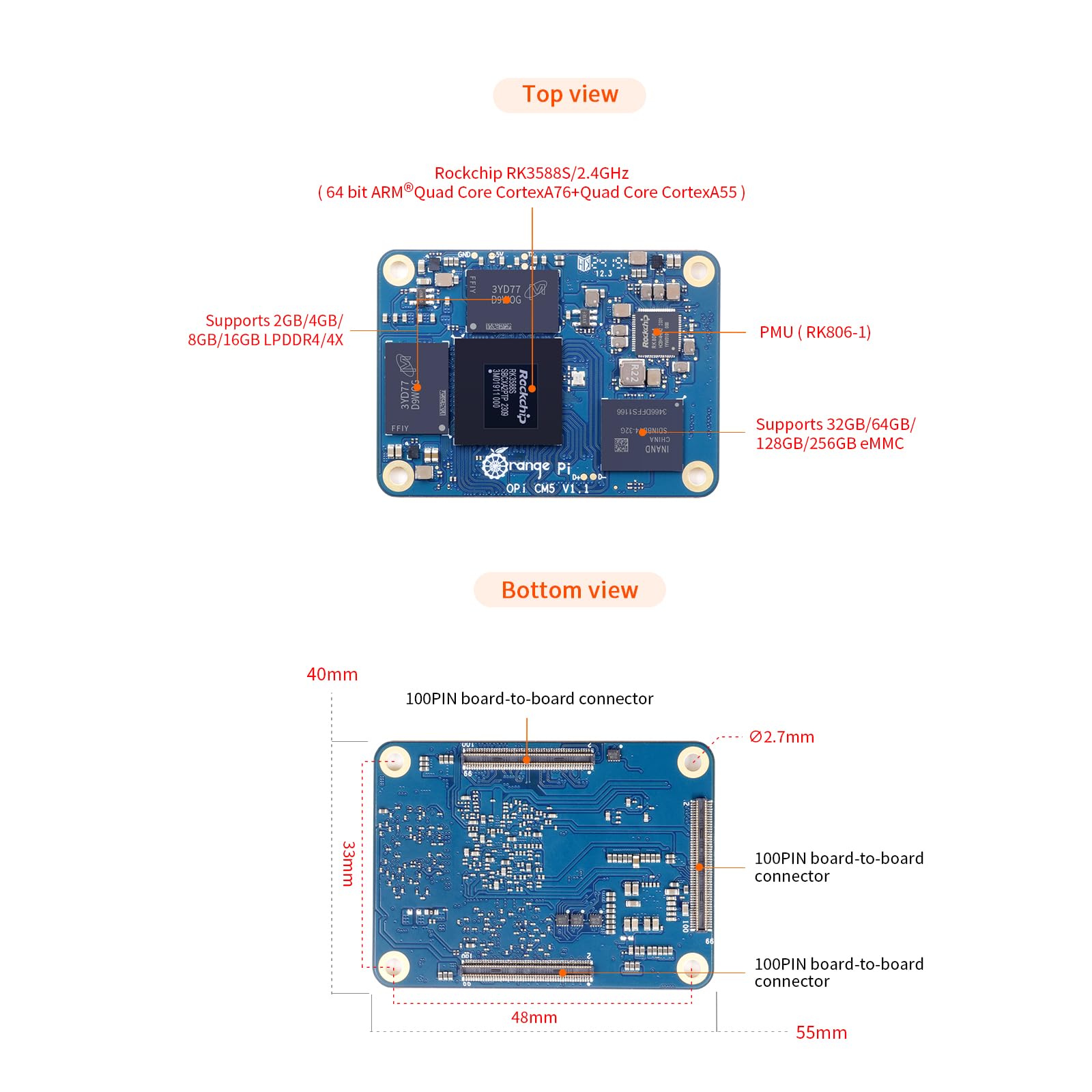 Orange Pi CM5 8GB RAM with 32GB EMMC LPDDR4 Rockchip RK3588S AI Accelerator 6TOPS, Compute Module 5 WiFi Bluetooth BLE Single Board Computer