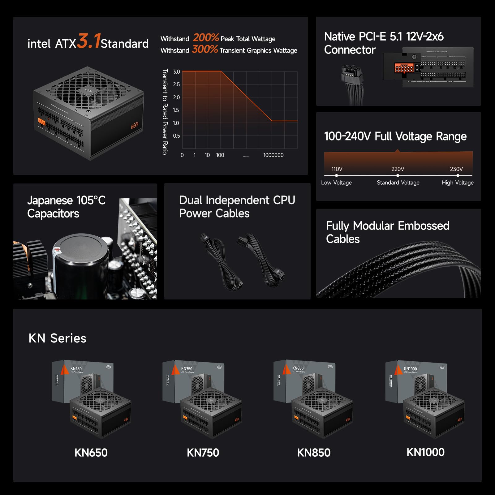 PCCOOLER KN (2025) Fully Modular Low-Noise ATX Power Supply with 12V-2x6 Cable - ATX 3.1 & PCIe 5.1 Compliant, Cybenetics Gold Efficiency, 105°C-Rated Capacitors, Modern Standby Mode - Black