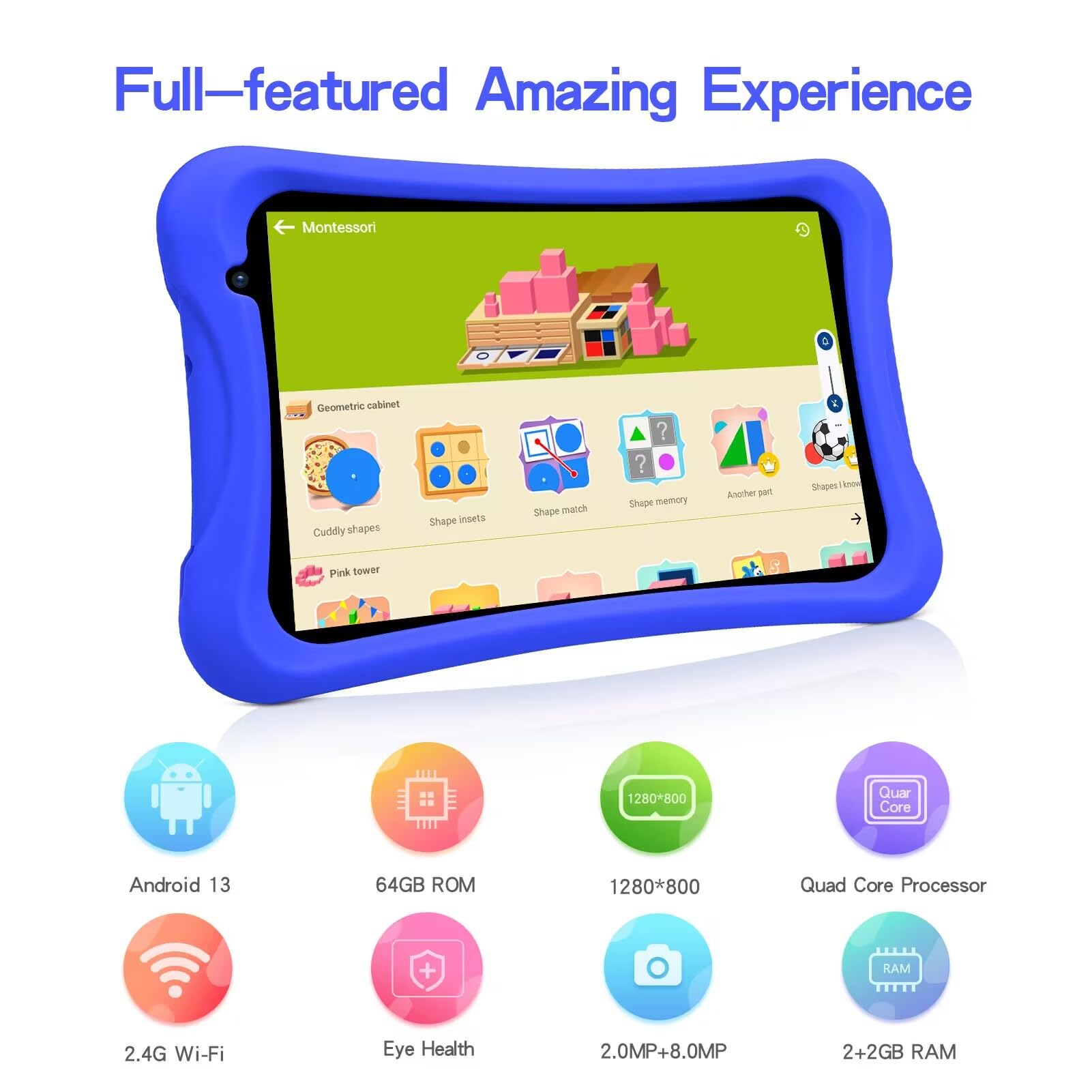 PRITOM 8 inch Quad Core Android Tablet, 64GB, WiFi, Bluetooth, Dual Camera, Educationl, Games,Parental Control, Kids Software with Kids-Tablet Case(Blue)
