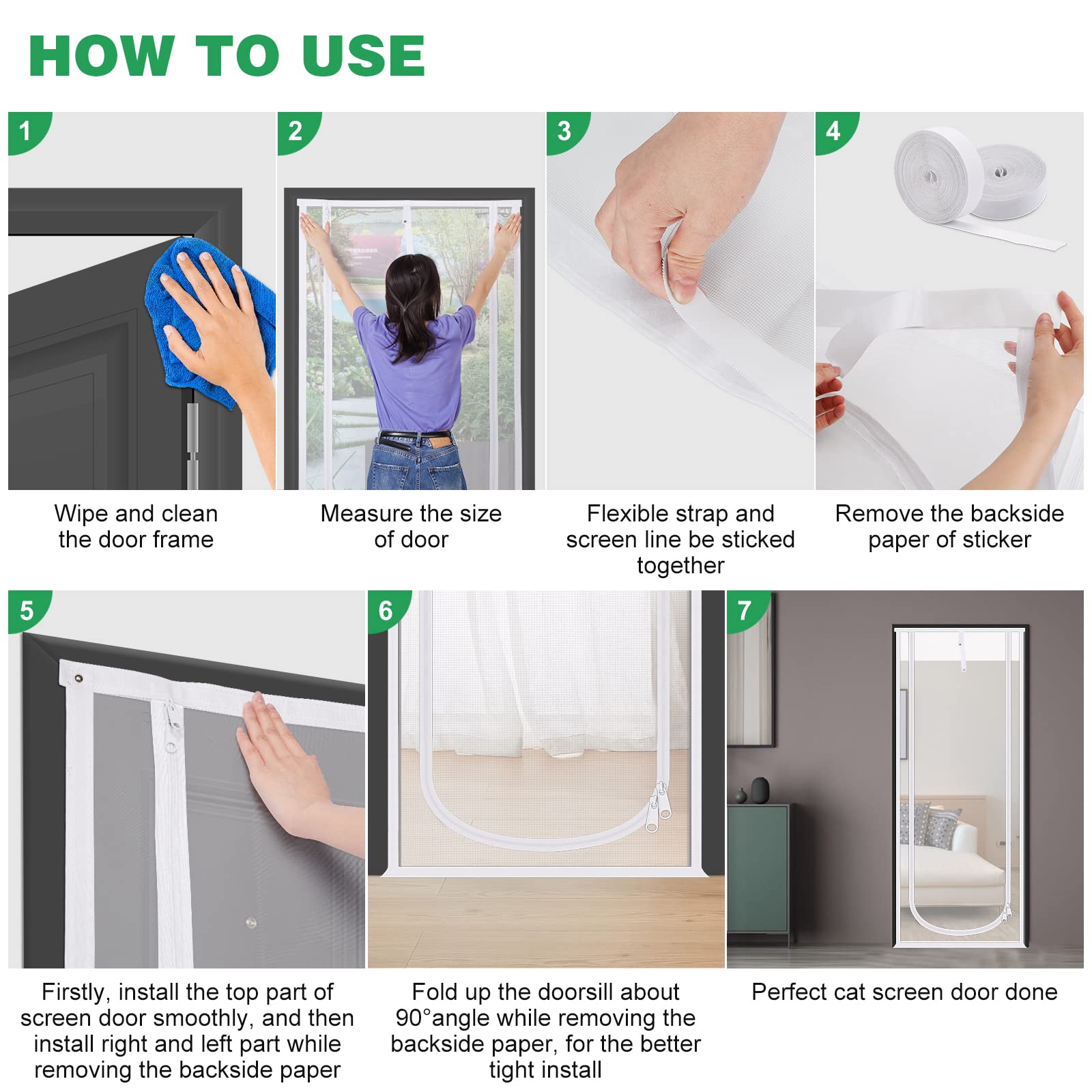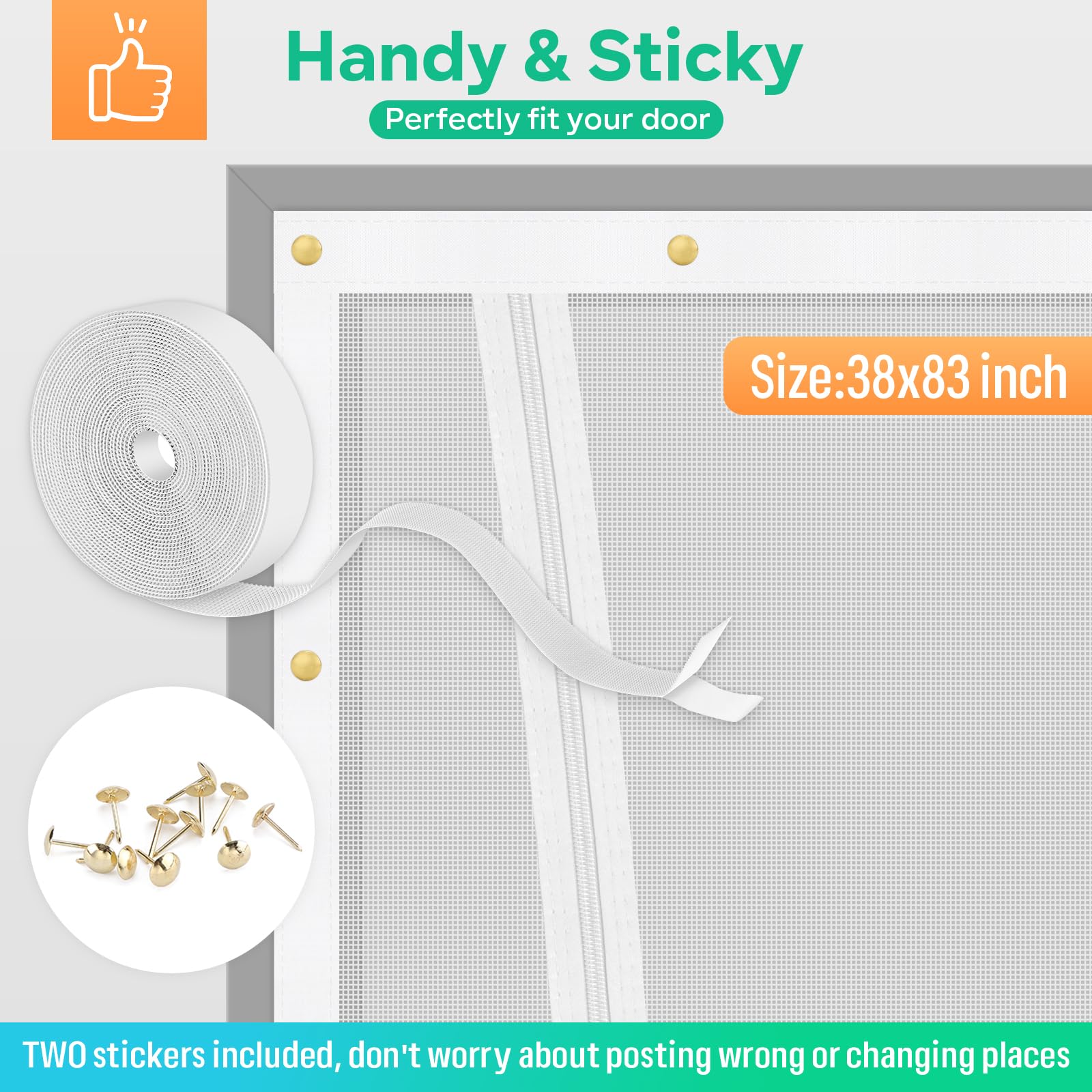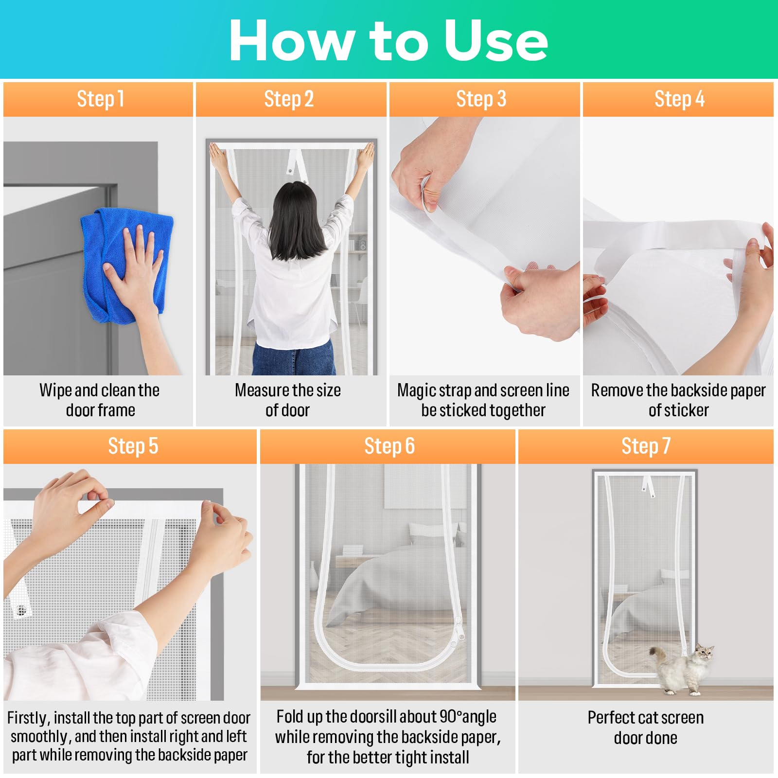 • 【Easy to Install& Remove& Clean】 No tools required. Just need to peel the adhesive backing off the hook&loop strips and apply to the door frame. You may push pins to secure the screen into its place. Also it can be removed easily without damage your door frame.