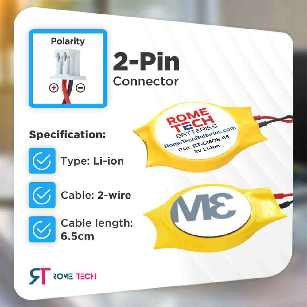 Rome Tech CMOS Battery for Dell Alienware M11x, M11x R2, M11x R3, M14x, M14x R2 - Backup BIOS RTC 3V CR2032 with 2 Pin 2 Wire Cable