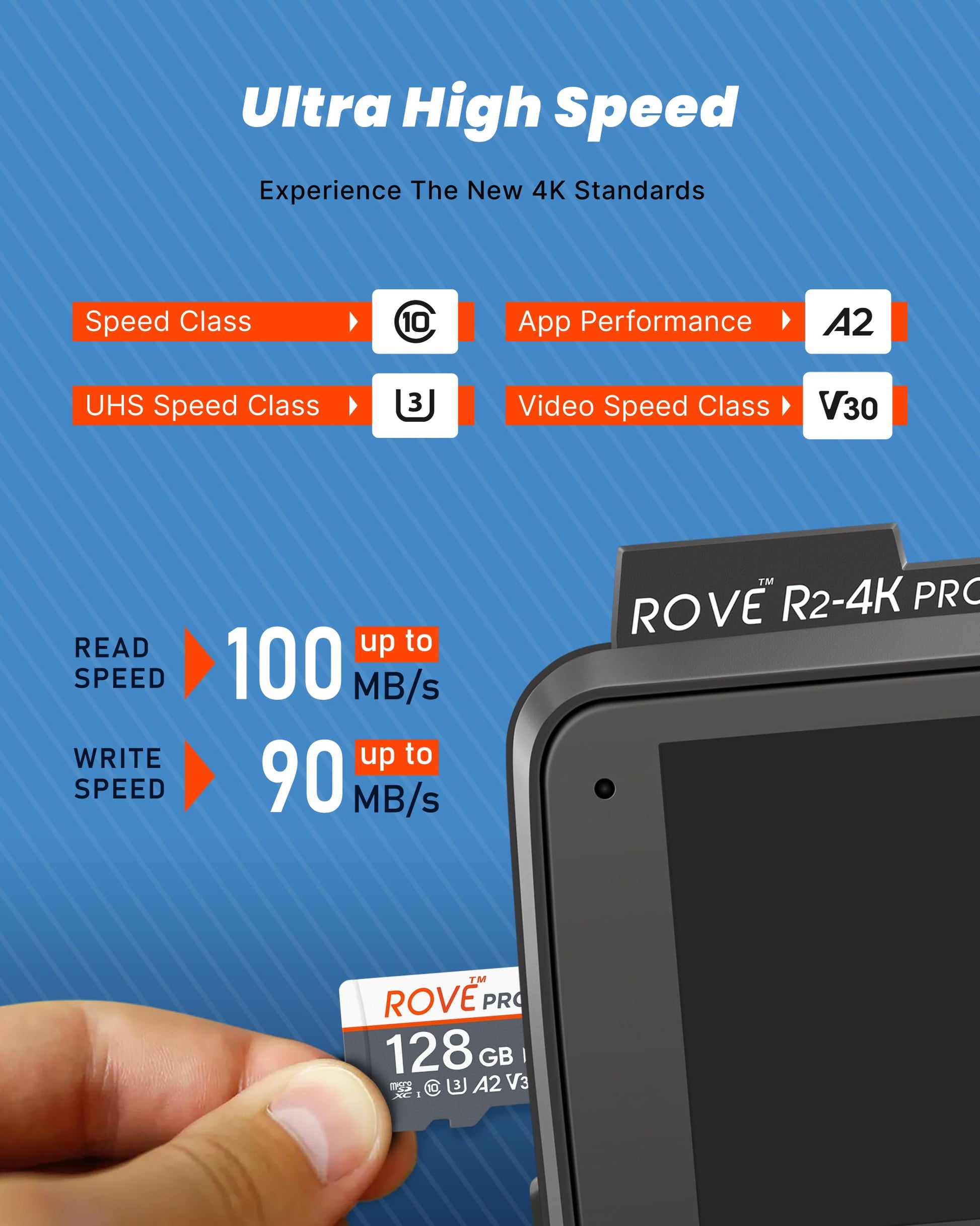 ROVE PRO Micro SD Card microSDXC 128GB Memory Card with Full-Size SD Adapter 100MB/s Read Speed, C10, U3, V30, 4K, A2 for Dash Cam, Android Smart Phones, Tablets, Games