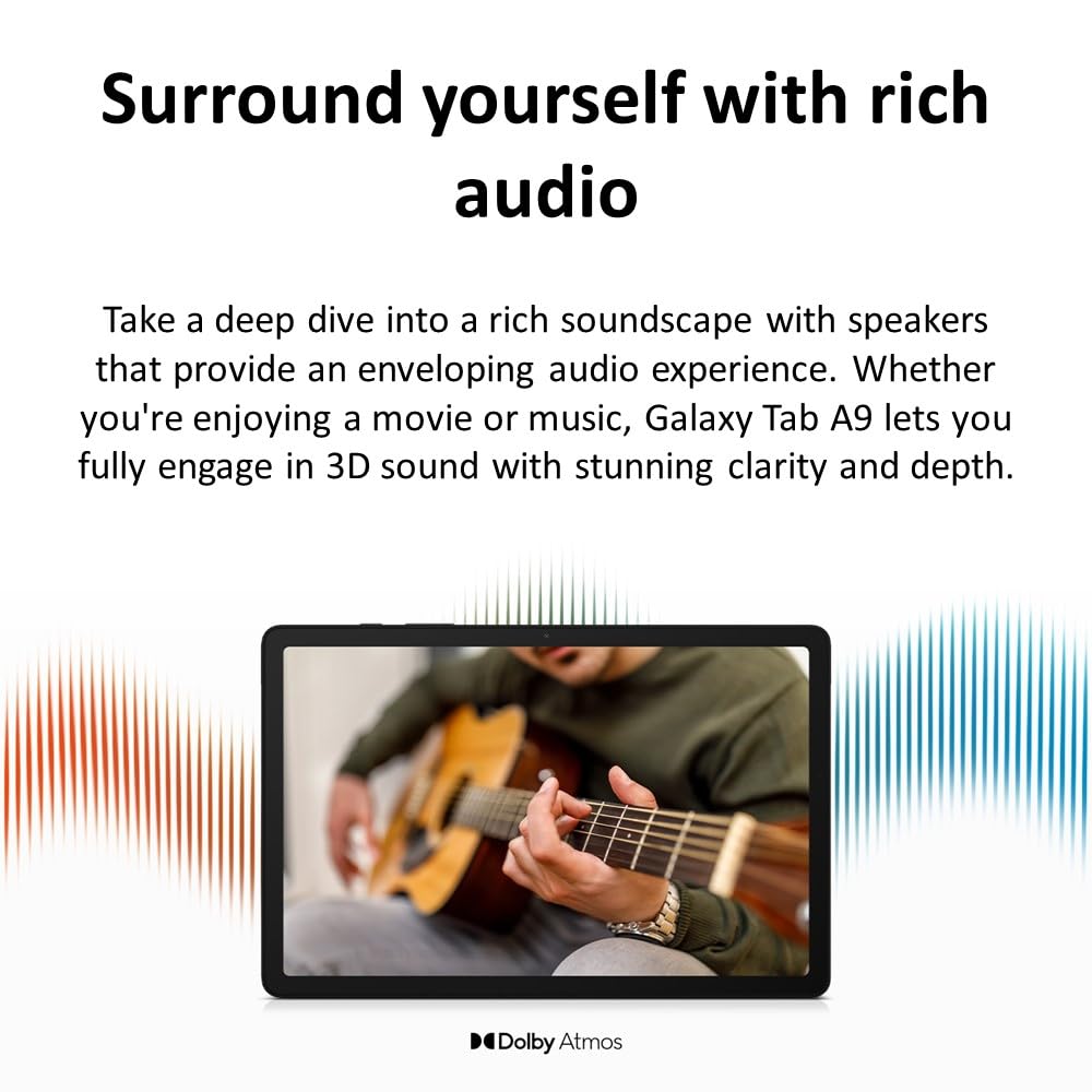 The Samsung Galaxy Tab A9 is an 8.7 4G LTE Android tablet with 64GB storage, 4GB RAM, octa-core CPU, and dual speakers.