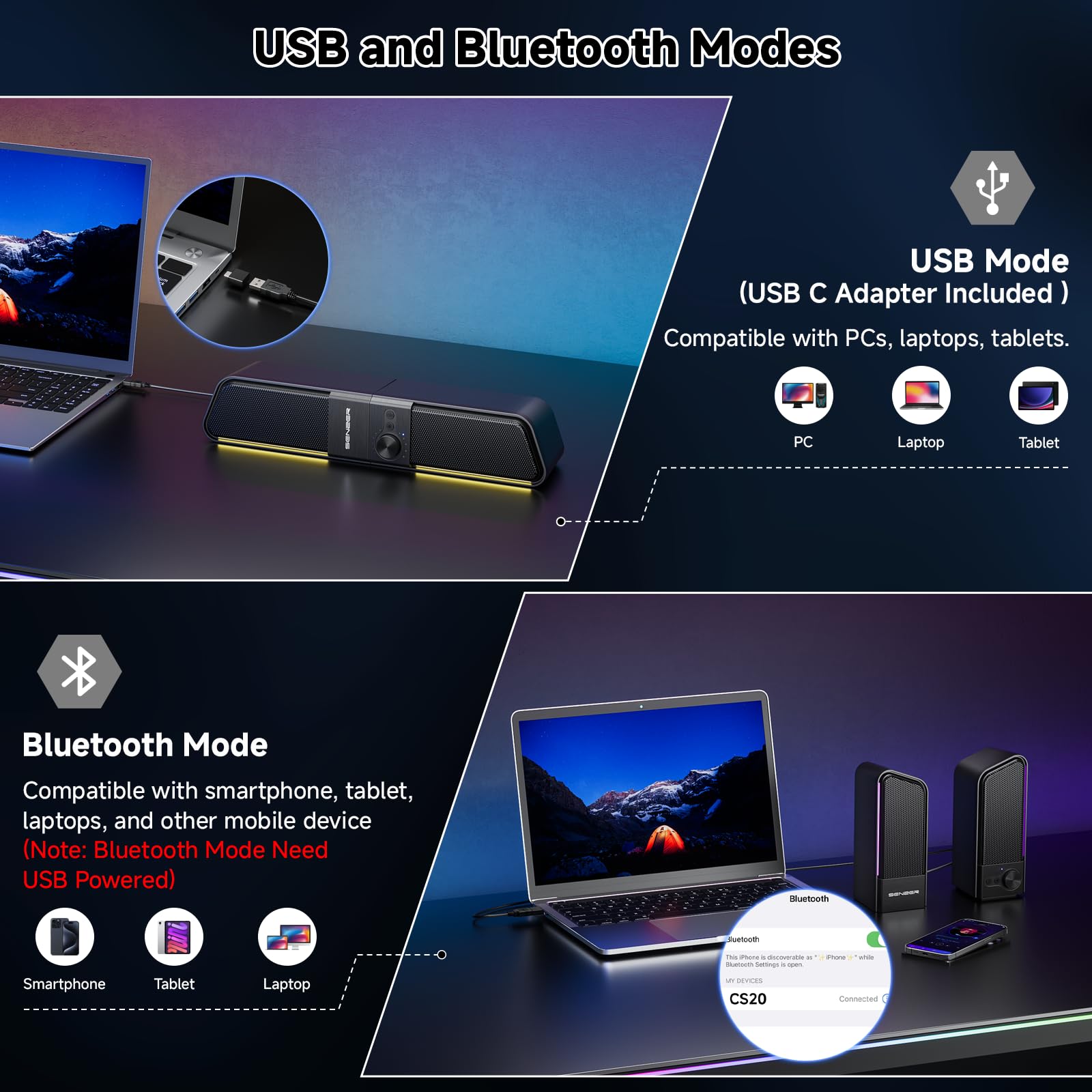 SENZER CS20 2 in 1 Bluetooth Computer Speakers for Desktop, USB Plug & Play Clear Sound PC Speakers with RGB Light, Monitor Sound Bar with Volume Knob, Gaming Speaker for PC Laptop Phone Tablet