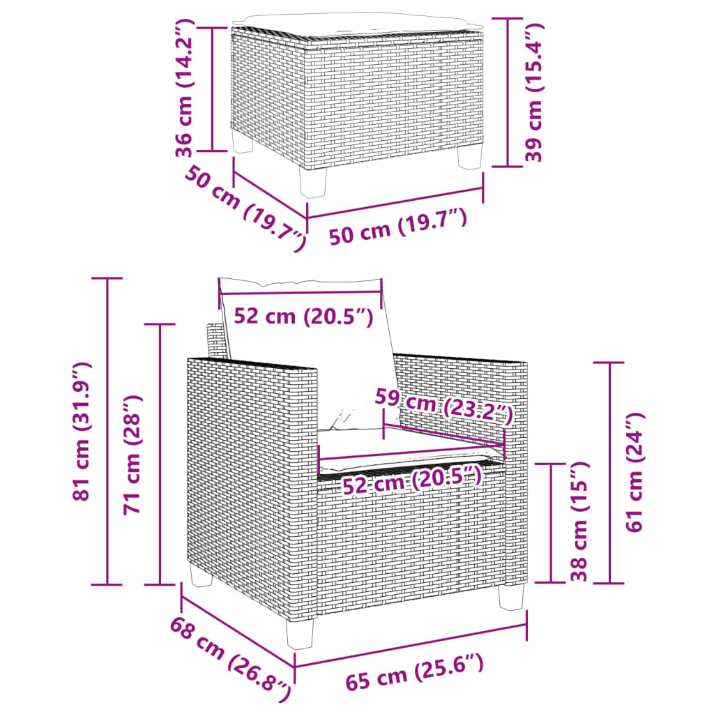 Genieße eine Tasse Kaffee oder unterhalte dich mit deiner Familie und deinen Freunden im Garten, Hinterhof oder auf dem Balkon mit diesem bequemen Bistro-Set! Langlebiges Material: PE-Rattan, auch als Poly Rattan bekannt, ist ein robustes, pflegeleichtes synthetisches Material, das die Optik von natürlichem Rattan aufweist. Es kennzeichnet sich durch ein geringes Eigengewicht und lässt sich einfach reinigen. Aufgrund seiner Haltbarkeit und Witterungsbeständigkeit wird es häufig bei der Herstellung von Gartenmöbeln verwendet.Bequemes Sitzerlebnis: Dieser Gartensessel mit dick gepolsterten Kissen bietet ein angenehmes Sitzgefühl.Abnehmbarer und waschbarer Bezug: Diese Sitzkissen verfügen über abnehmbare Bezüge für einfaches Waschen und Pflegen.Vielseitiger Fußhocker: Der Hocker ist vielseitig einsetzbar und dient als bequeme Fußstütze beim Entspannen auf dem Sofa oder als zusätzlicher Sitzplatz in deinem Garten.Robuster und stabiler Rahmen: Dank des pulverbeschichteten Stahlrahmens ist das Möbelstück robust, stabil und für den täglichen Einsatz im Außenbereich geeignet. Gut zu wissen:Wir empfehlen dir, deine Gartenmöbel mit einer wasserdichten Hülle zu schützen, um lange Zeit eine ansprechende Optik aufzuweisen.
