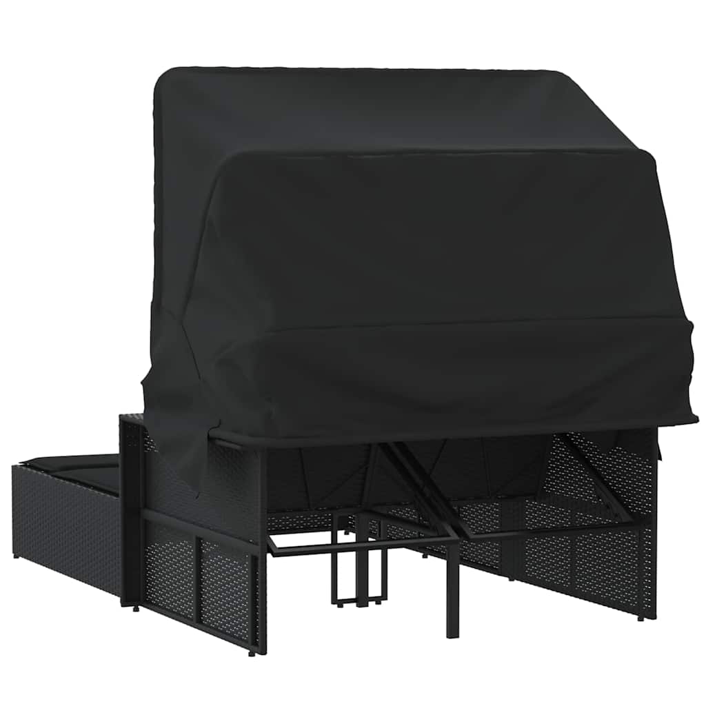 Doppel-Sonnenliege mit Dach und Auflagen Schwarz Poly Rattan
