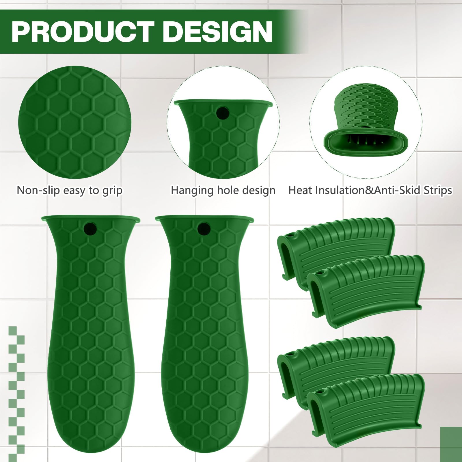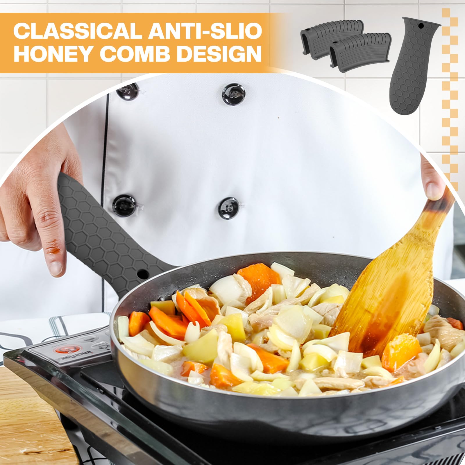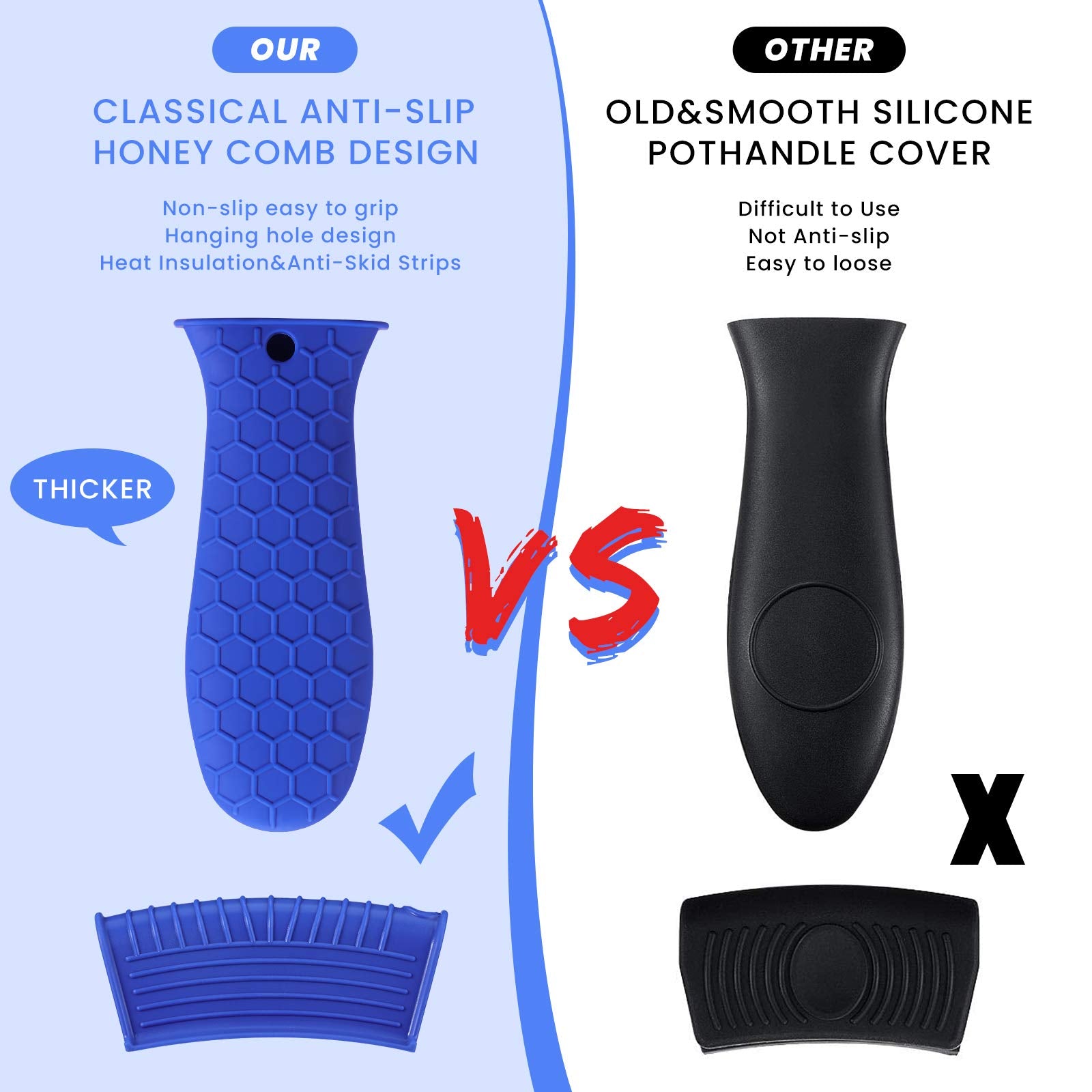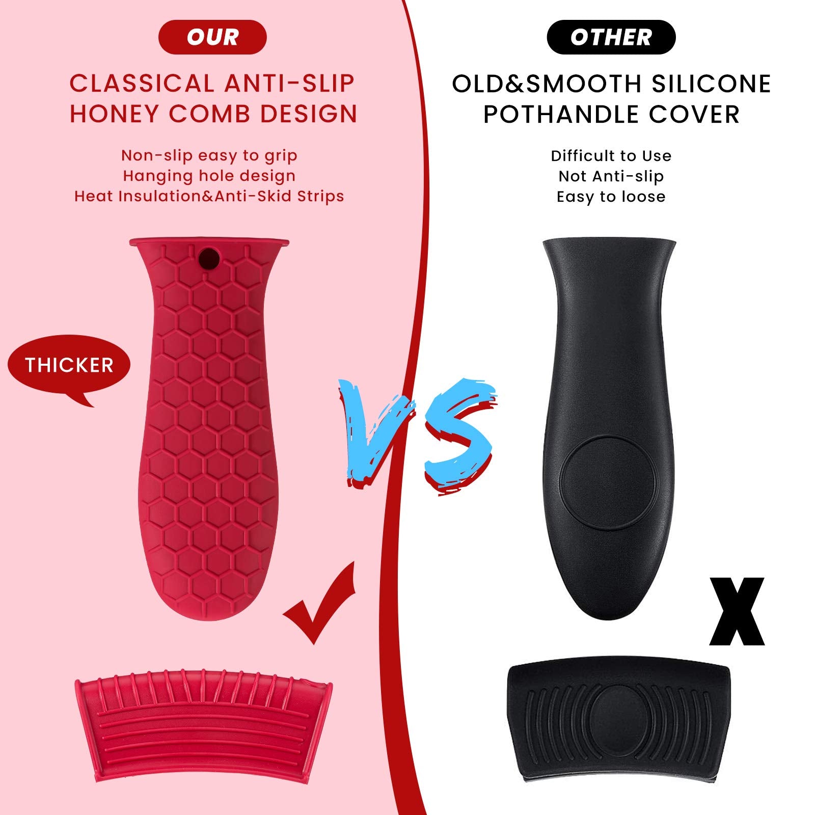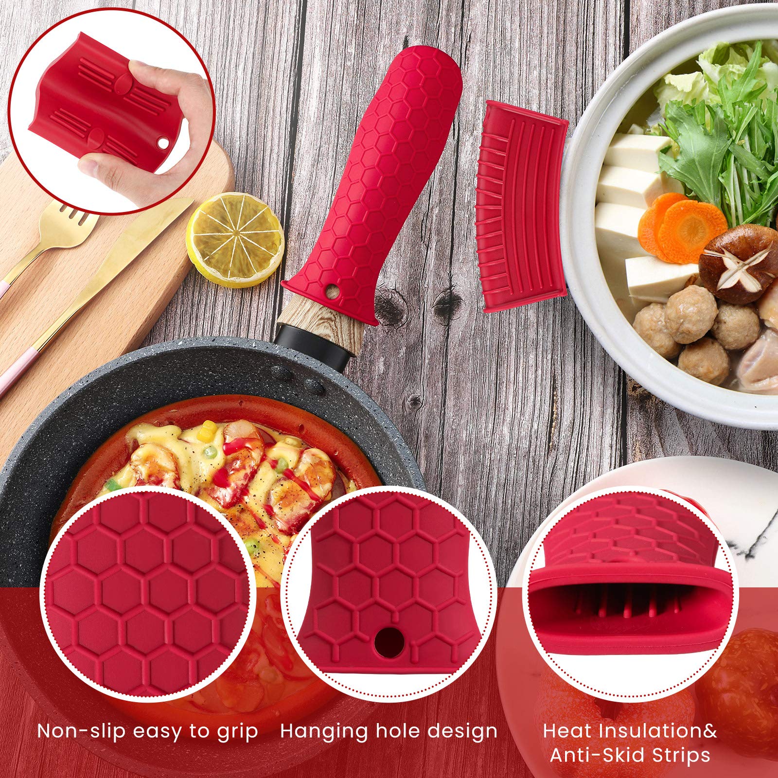 • Anti-slip design: these hot resistant pot sleeve grip handle holders feature honeycomb pattern design on the outside and concave-convex design on the inside to make the handle holder grip stronger and less slippery; The silicone hot skillet handle cover has a handy hanging hole if you prefer to store on a hook, making cooking, baking, etc. in your kitchen easier and fun
