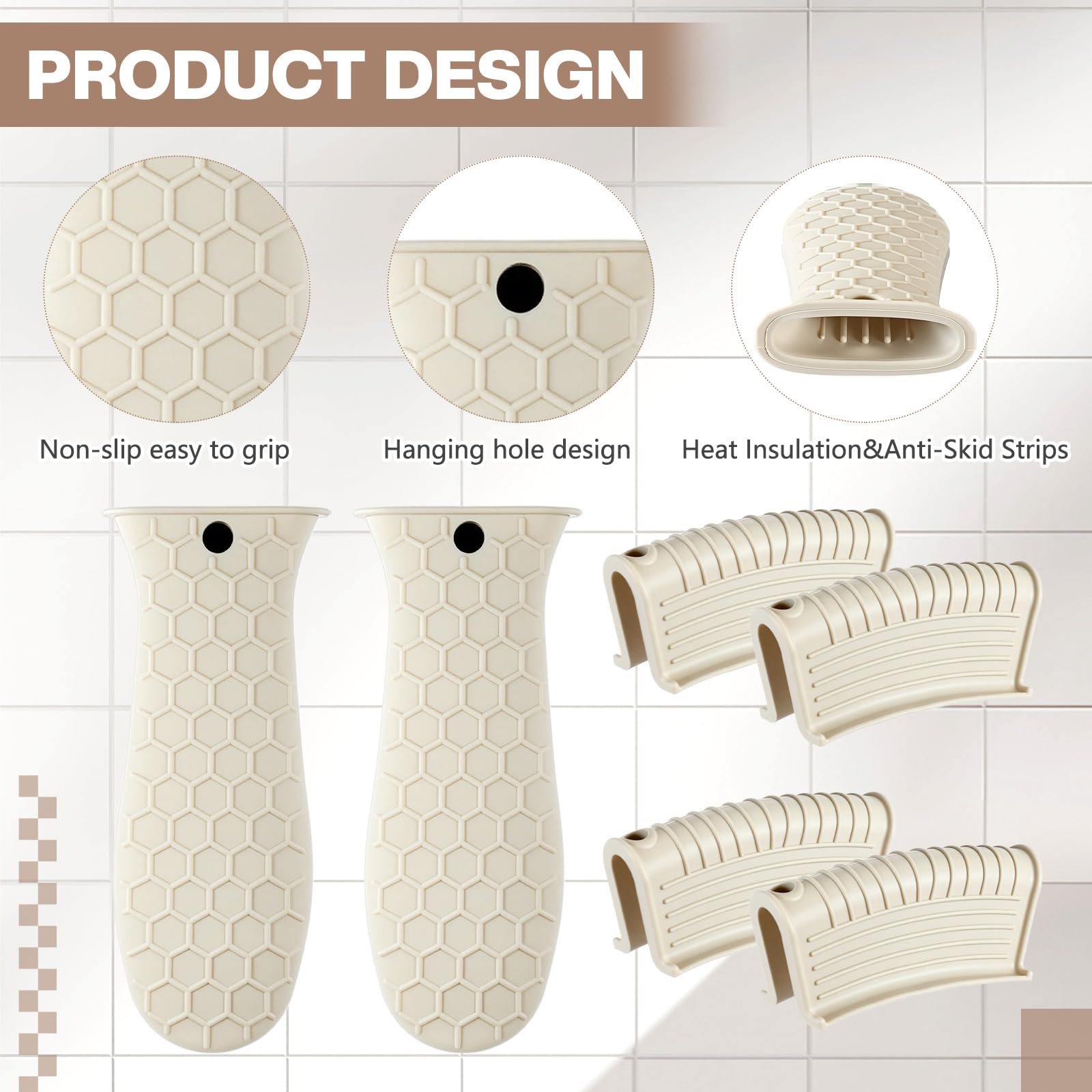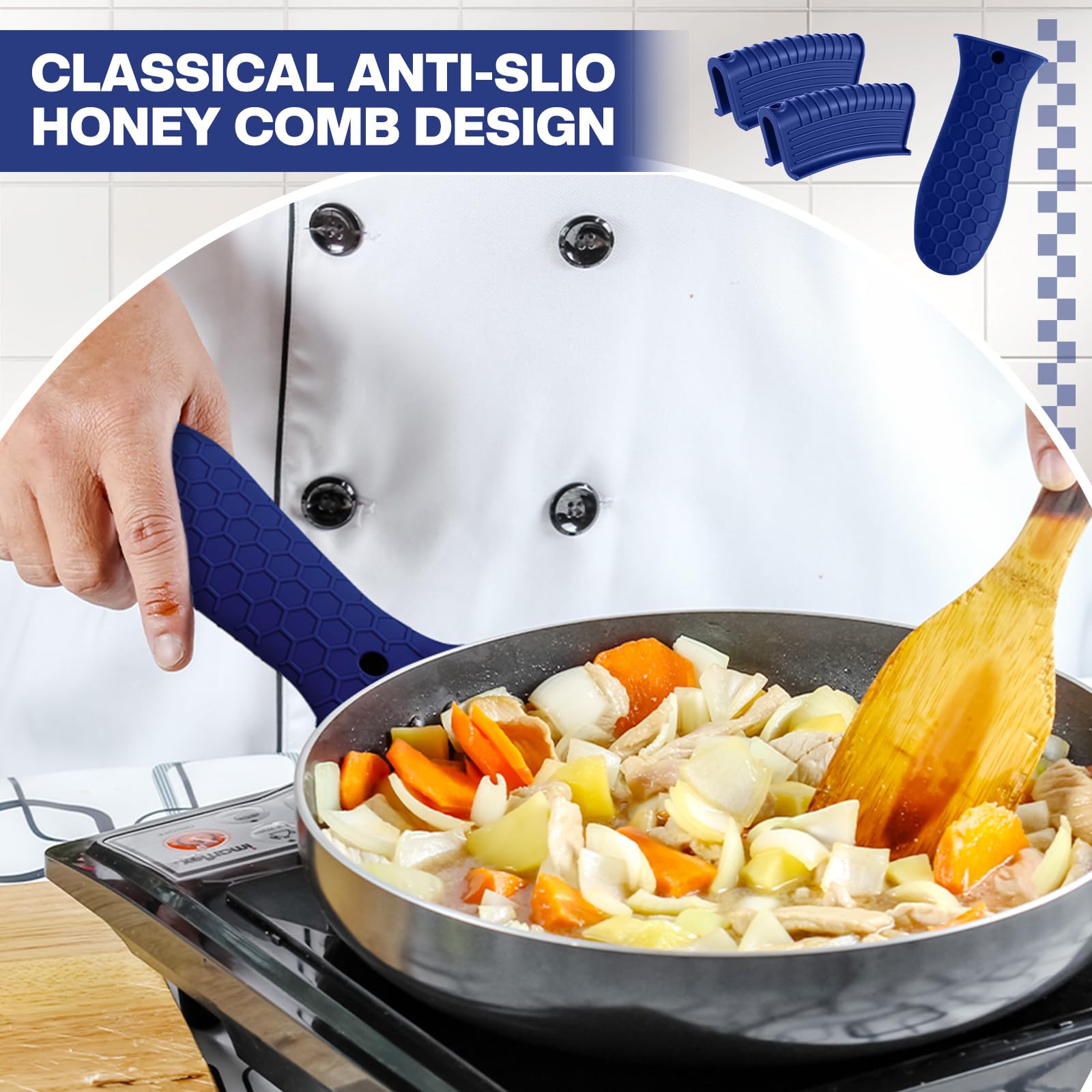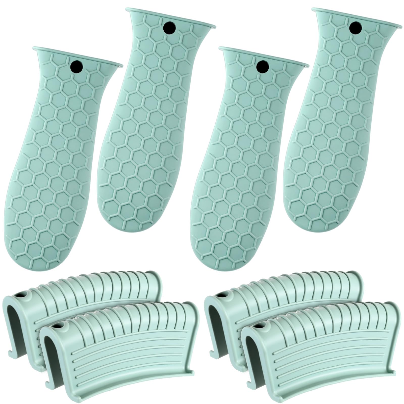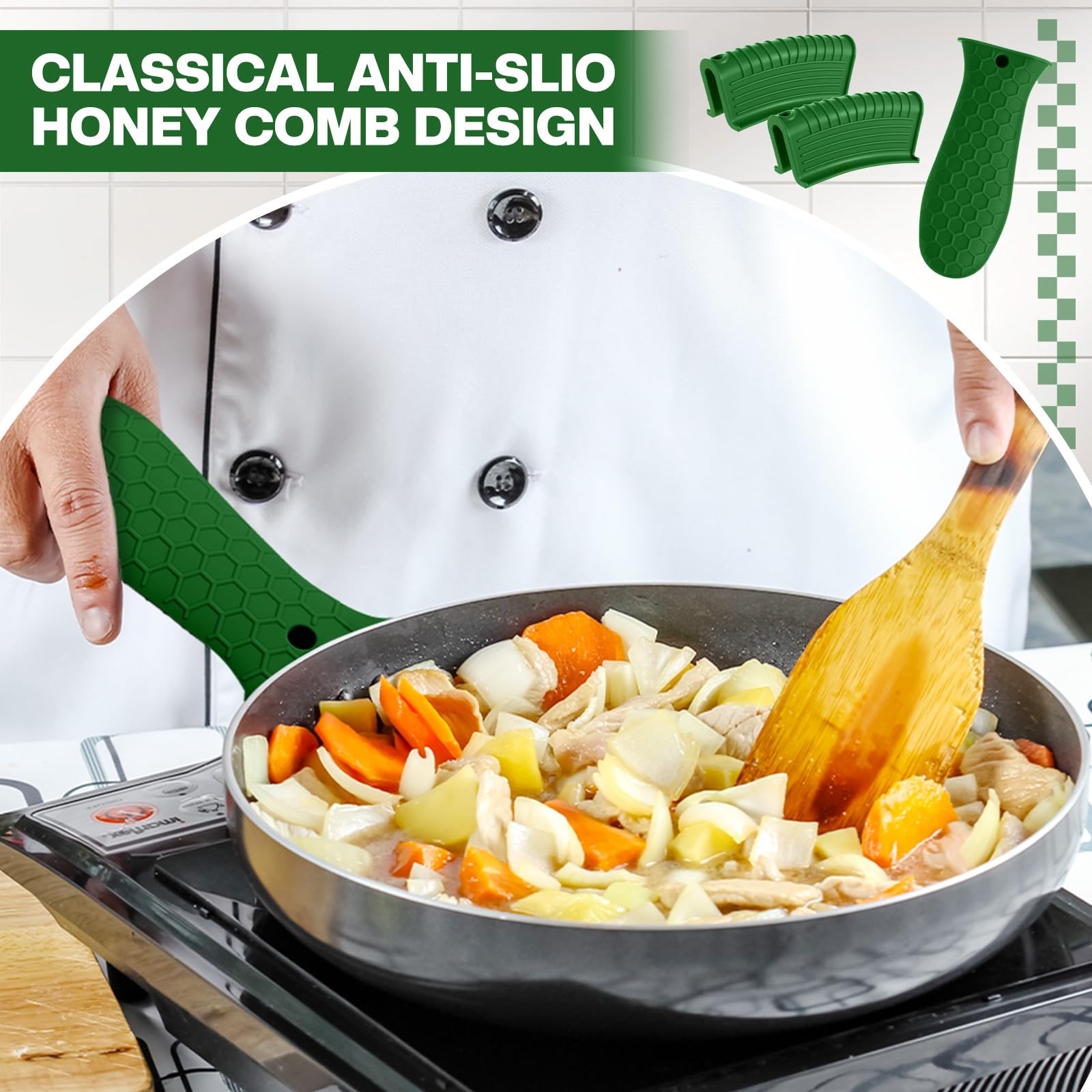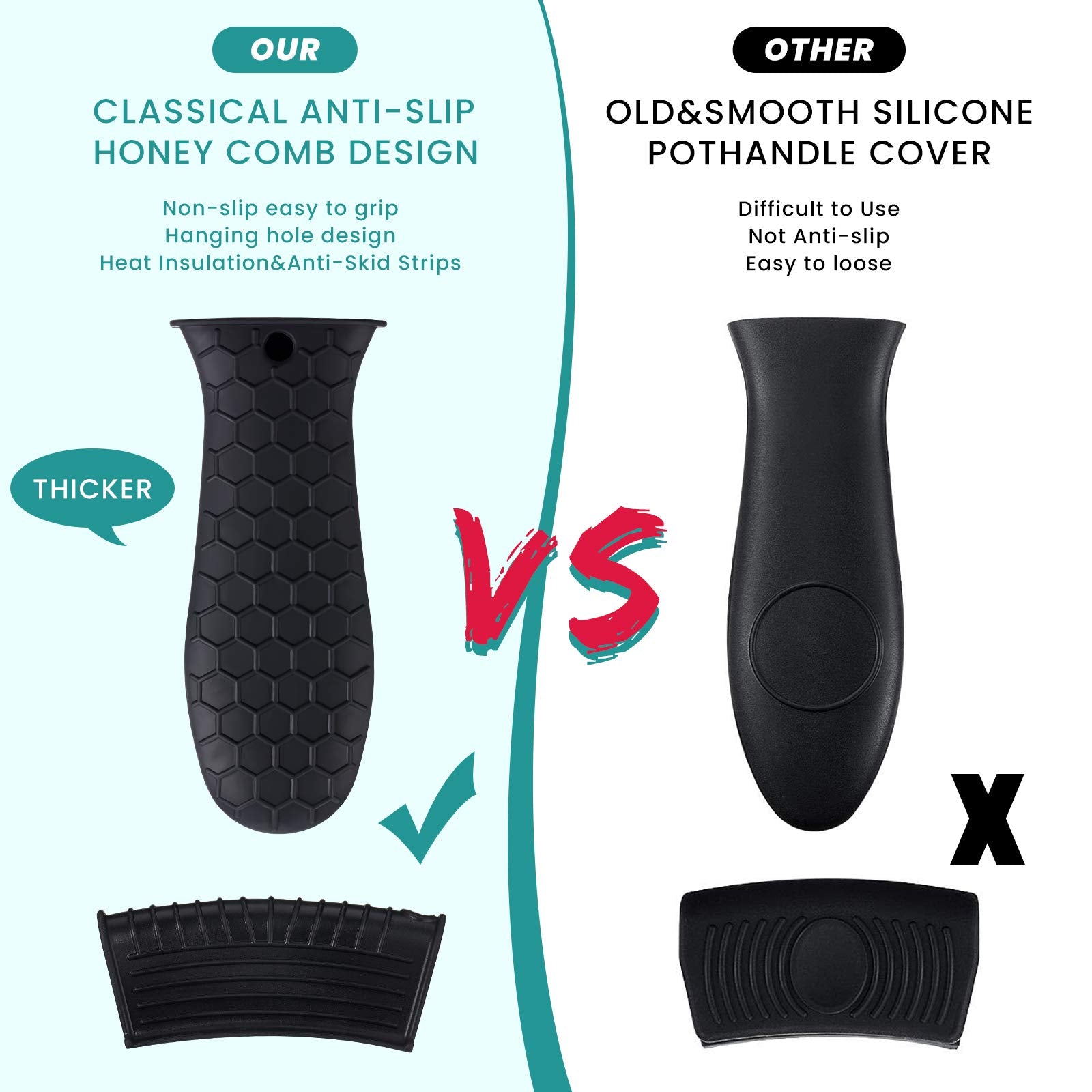 • Anti-slip design: these hot resistant pot sleeve grip handle holders feature honeycomb pattern design on the outside and concave-convex design on the inside to make the handle holder grip stronger and less slippery; The silicone hot skillet handle cover has a handy hanging hole if you prefer to store on a hook, making cooking, baking, etc. in your kitchen easier and fun