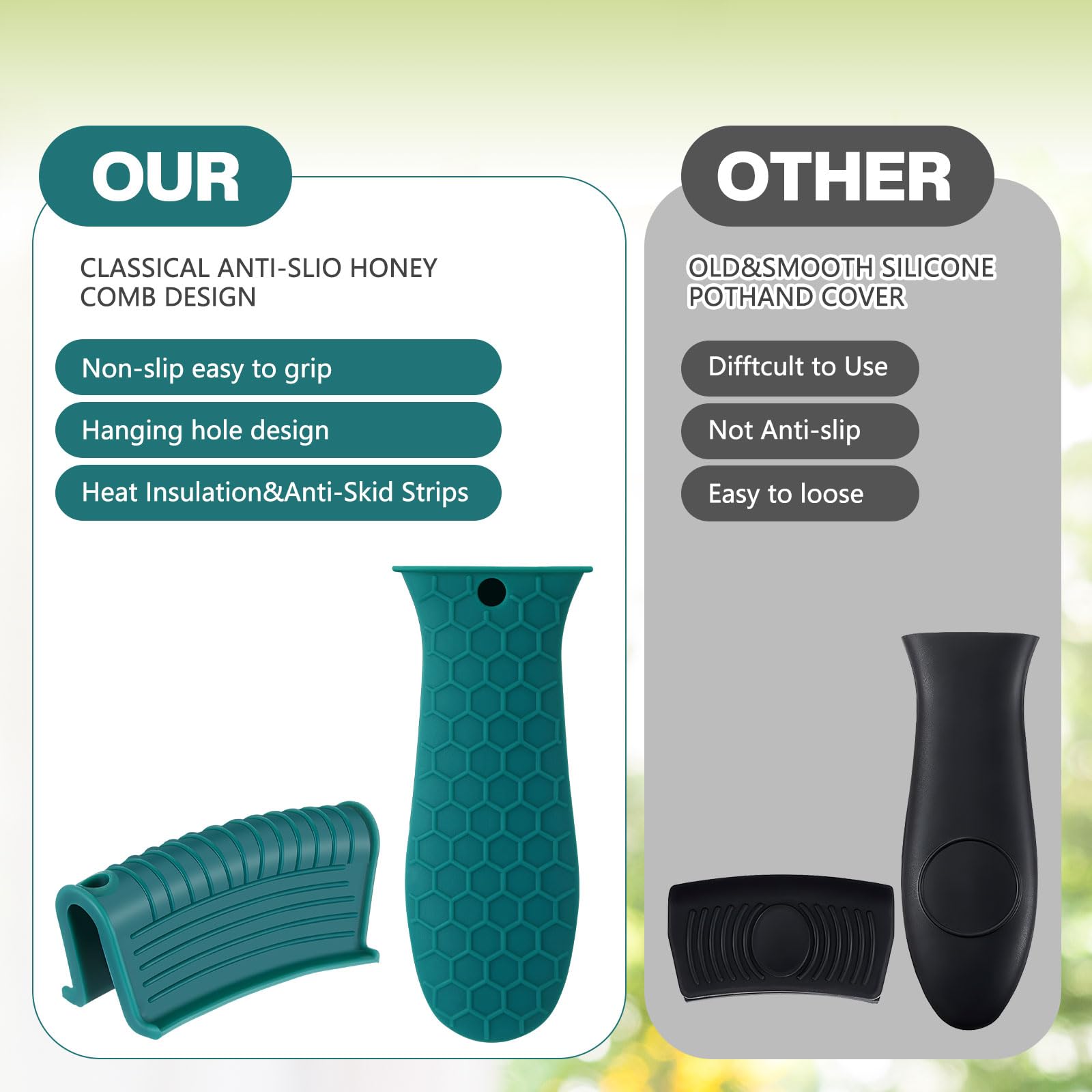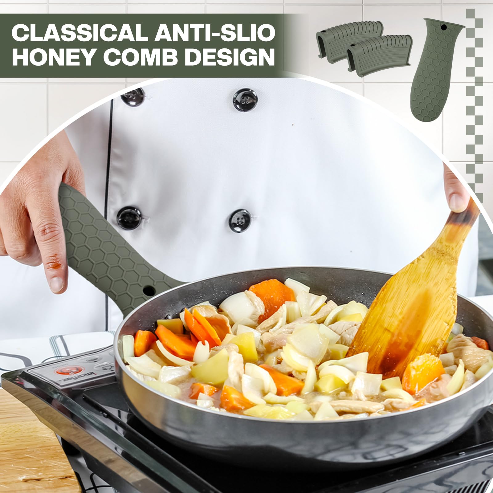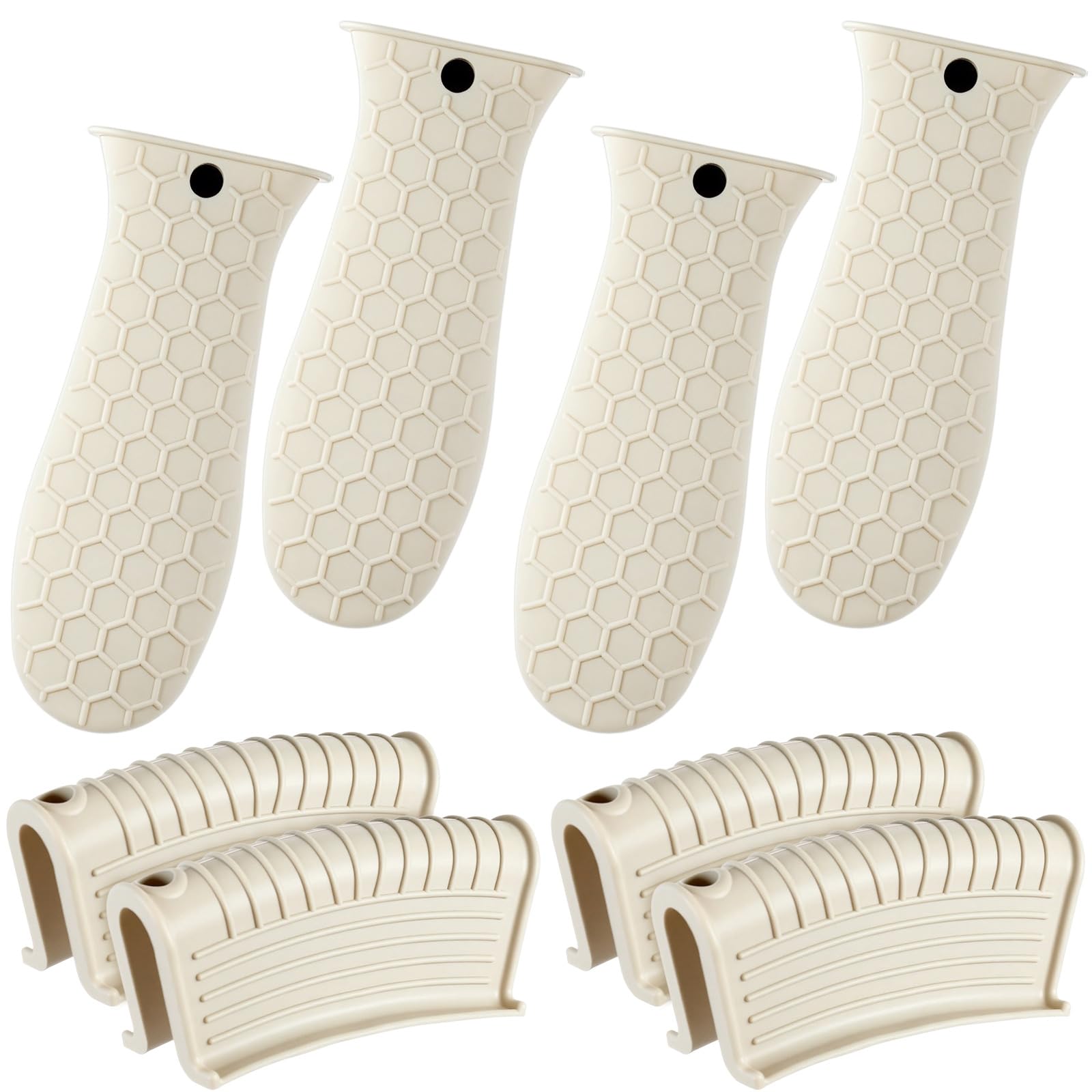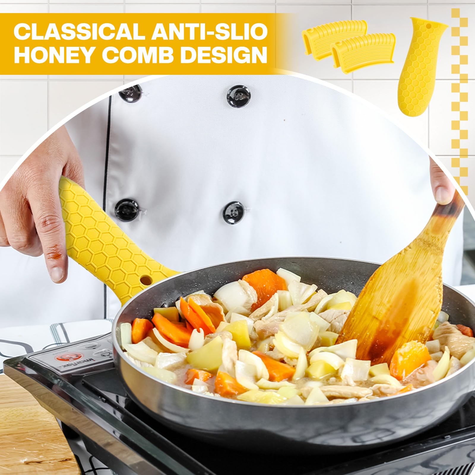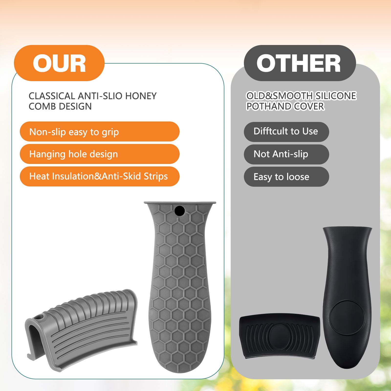 • Anti-slip design: these hot resistant pot sleeve grip handle holders feature honeycomb pattern design on the outside and concave-convex design on the inside to make the handle holder grip stronger and less slippery; The silicone hot skillet handle cover has a handy hanging hole if you prefer to store on a hook, making cooking, baking, etc. in your kitchen easier and fun