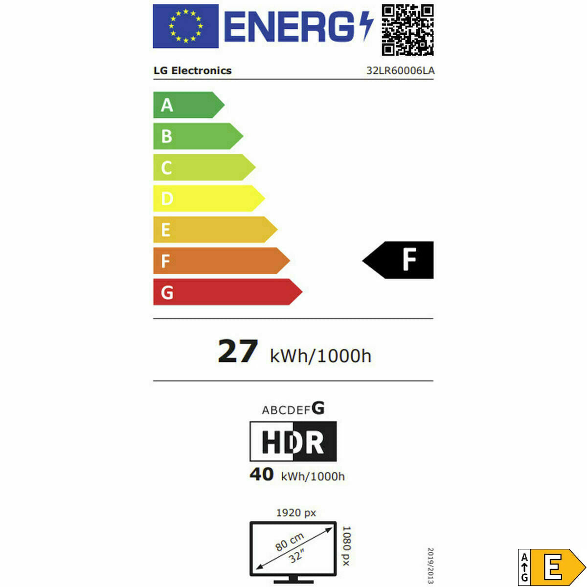 The LG 32LR60006LA.AEUQ 32-inch Smart TV combines functionality and design with a 32" Full HD screen that delivers sharp, clear image quality, ideal for small spaces or secondary rooms. Its black finish adds a sleek, modern style that fits easily into any setting. This smart TV features an operating system that enables web browsing and access to multiple apps via Bluetooth connectivity and USB 2.0 ports, allowing easy playback of external content. It stands out for its reception capabilities, both analog and digital, supporting DVB-C, DVB-S2, DVB-T, and DVB-T2 tuners, ensuring compatibility with the most common signal standards in Europe and offering versatility to receive different broadcast types. Its 16:9 aspect ratio provides an optimized widescreen view for movies and TV. Although it has an energy rating of F, indicating moderate consumption, it remains a balanced option within its segment. Overall, this LG model is a practical and affordable solution for those seeking a compact Smart TV with connectivity, enhanced image quality, and discreet design, perfect for enjoying digital audiovisual content with basic yet functional features.