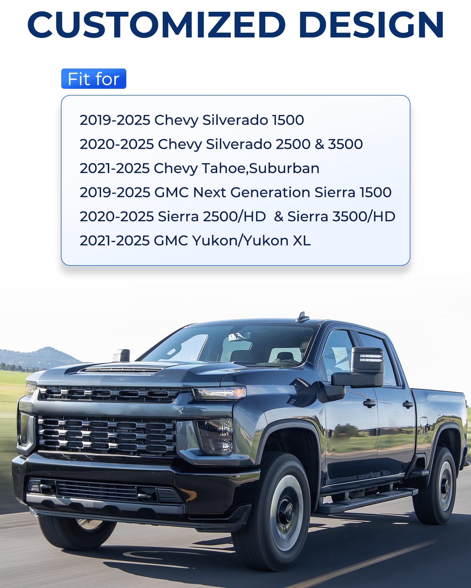 Versatile Compatibility: Our Laptop Mount is compatible with 2019-2025 Chevy Silverado 1500, 2020-2025 Chevy Silverado 2500 & 3500, 2021-2025 Chevy Tahoe, GMC Sierra 1500, 2020-2025 Sierra HD 2500 & Sierra HD 3500. No drilling required, as it securely attaches to the passenger seat bolt with mounting angles of 0°, 45°, and 90°. Safety and Stability: Featuring a 1.5" ball joint and a heavy-duty base capable of holding up to 5kg, the mount's segmented joint structure distributes the weight of the computer evenly, enhancing stability. The aluminum alloy base securely anchors to the passenger seat bolt, ensuring stability during high-speed or bumpy road conditions. Dynamic Adjustability: Enjoy height adjustment from 11.9" to 20" and two 180° rotating arms with a maximum reach of 20". Three adjustable locking joints allow for quick installation and removal, providing flexibility to cater to different heights and seating positions. Efficient Cooling System: Designed to accommodate laptops ranging from 10" to 17" , the top tray features five adjustable clamp holders to ensure device stability. Equipped with dual USB-powered fans, it creates a robust cooling system, preventing overheating and extending the device's lifespan. Enhanced Comfort: Elevating office comfort, the mount reduces discomfort from prolonged computer use such as leg heat, neck strain, and shoulder pressure. Its height adjustment and rotation design save space, reduce eye fatigue, facilitate seamless switching between computers and phones, and boost work productivity and efficiency.