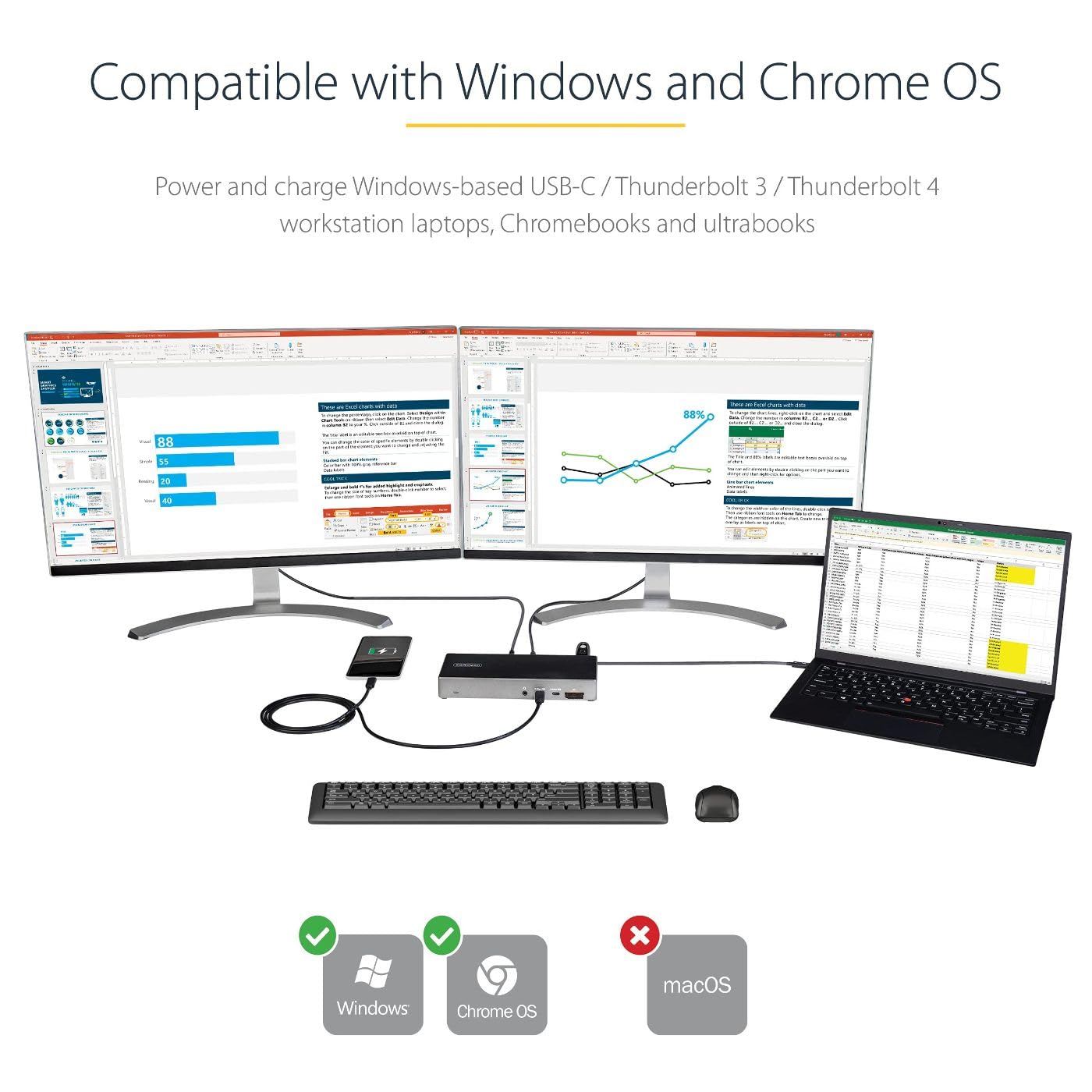 This USB-C Gen 2 10Gbps docking station turns your USB-C or Thunderbolt 3 Windows laptop or Chromebook into a powerful workstation. A USB 3.2 Gen 2 Type-C dock features everything you need, from triple video outputs up to 4K 60Hz to 10Gbps USB-C & USB-A downstream peripheral ports to 100W Power Delivery. HDMI & DisplayPort for Triple Monitor Outputs This USB-C Gen 2 docking station with DP 1.4 and HDMI 2.0 HBR3 support, is a perfect choice for dual or triple monitor setup, supporting up to triple 4K 60Hz display output, with two DisplayPort and one HDMI video outputs, on USB-C Gen 2 (with DP 1.4 support) laptops Windows-based Thunderbolt 3 or USB-C laptops. Power & Charge with 100W Power Delivery Power and charge USB-C/Thunderbolt 3 workstation laptops & ultrabooks with 100 watt power delivery, to keep high performance laptops sufficiently charged during heavy productivity usage. Charge smartphones and other devices with USB-C downstream charging ports featuring BC 1.2 charging specification. Fast-charge ports support always-on charging so devices will charge whether or not a host laptop is connected. Integrated 6-Port USB Hub & SD Card Reader This USB-C Gen 2 docking station features 6 downstream USB ports in total to connect USB peripherals and an SD 3.0 UHS-I card reader for media storage. 2x USB-C 3.2 Gen 2 - 10 Gbps (BC 1.2 Fast-Charge + Always-On) 2x USB-A 3.2 Gen 1 - 5 Gbps 2x USB-A 2.0 - 480 Mbps SD 3.0 UHS-I Card Reader Also included, is a gigabit Ethernet port with PXE Boot, as well as 4-position TRRS stereo audio for a headset and mic. Additional Security Features This USB-C docking station comes with plenty of security features two K-slots for a Kensington style laptop lock. Connected Device Transparency with the StarTech.com MAC Address Changer Utility The DK31C2DHSPD includes a free Windows application that enables you to better manage your enterprise network security. When you connect to your network through the ethernet port of the dock, the computer's MAC address is typically not broadcast to the network, as your network only sees the MAC address of the docking station. However, the StarTech.com MAC Address Changer or Cloning software enables the USB-C dock to use MAC address spoofing of the connected Windows laptop rather than the MAC address of the dock itself. This ensures your network administrators have full visibility of each device on the network and can monitor and limit activity accordingly. To request access to our MAC Address Changer utility, please contact our Technical Support Department by phone, live chat, or e-mail.
